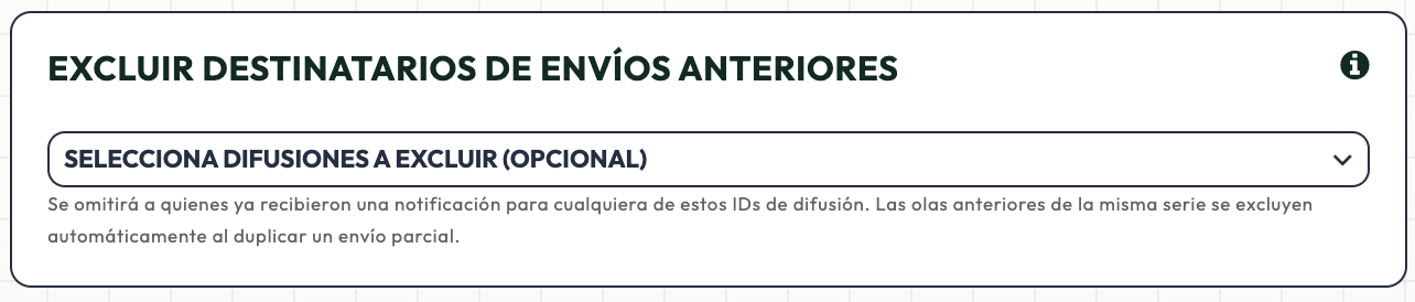 Ahora es posible excluir a los destinatarios que ya recibieron campañas anteriores, lo que ayuda a evitar envíos duplicados a la misma audiencia. Esto resulta especialmente útil al reutilizar campañas o al segmentar envíos de seguimiento con mayor precisión.