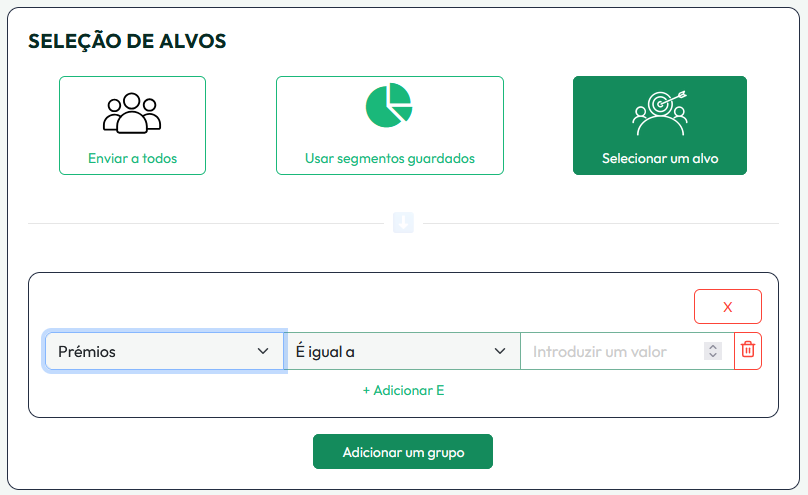 Seguidamente indique se pretende enviar a todos os seus contactos/clientes ou se pretende escolher um publico alvo especifico através dos filtros disponíveis (opção "Selecionar um Alvo")