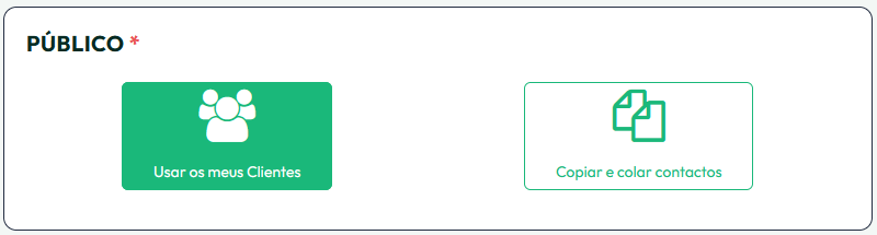 na opção "Público" poderá selecionar "usar os meus clientes", da sua conta Yalt ou introduzir contactos que tenha noutra base de dados na opção "Copiar e colar contactos