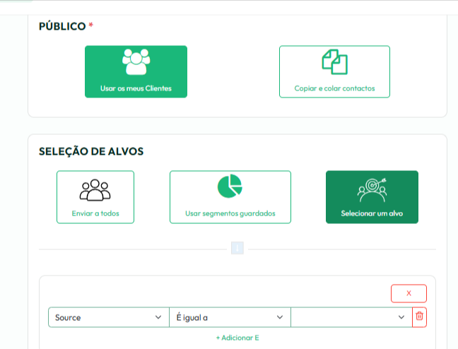 Seguidamente indique se pretende enviar a todos os seus contactos/clientes ou se pretende escolher um publico alvo especifico (opção "Selecionar um Alvo");