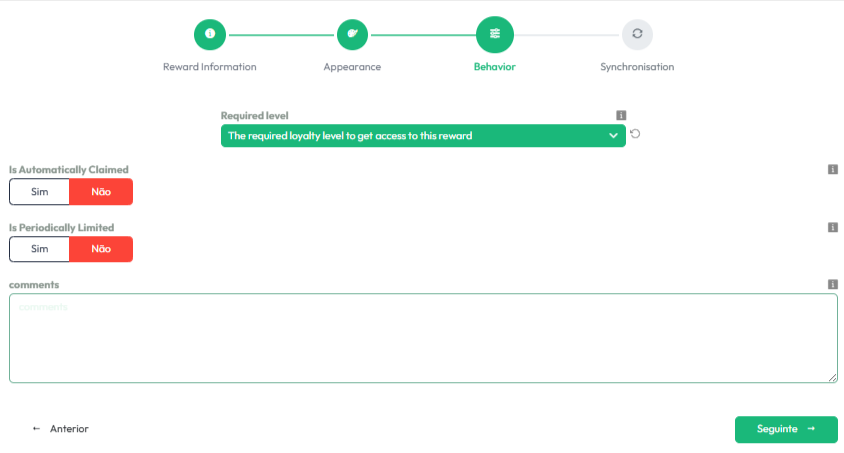Poderá também definir caso pretenda ou não que haja limitações periódica para redimir os seus prémios ou níveis específicos de fidelização para os mesmos;