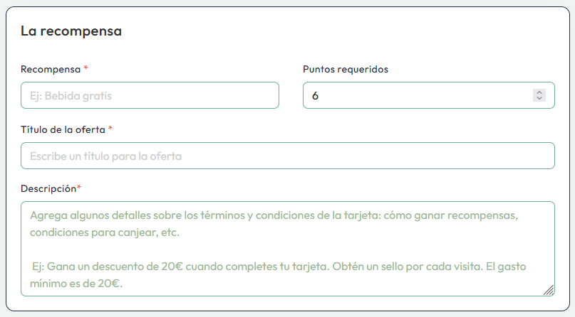 Define los parámetros de tu tarjeta, como la Recompensa a ofrecer, los Puntos para Redención, el Título de la Oferta y una Descripción de tu programa.