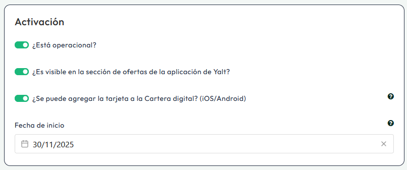 En el menú "Activación", selecciona en verde todas las opciones que deseas activar para tu Programa de Fidelización.
