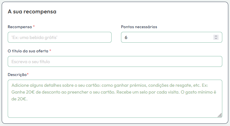 Defina os parâmetros do seu cartão, como qual a Recompensa a dar, os Pontos para Redenção, Título da Oferta e uma Descrição do seu programa