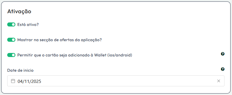 No menu "Ativação" selecione a verde todas as opções que pretende ativar para o seu Programa de Fidelização