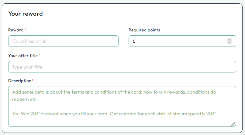 Set the parameters for your card, such as the Reward to offer, the Points for Redemption, Offer Title, and a Description of your program.