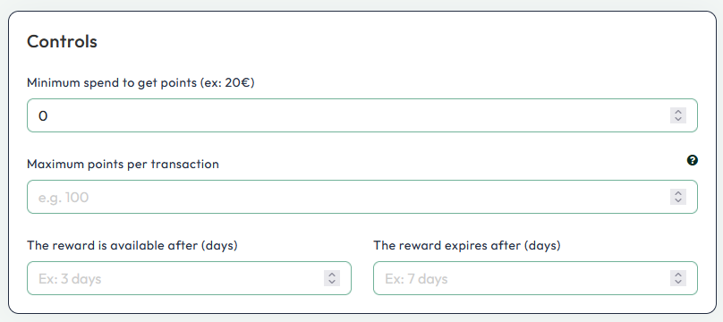 In the "Controls" menu, you can set the minimum purchase amount required to earn points, maximum points for each transaction, define when the points will be available to the customer, and set a deadline for their use.