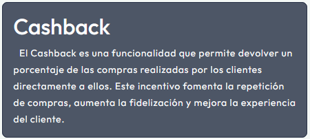 Con cada compra, el cliente acumula un valor de cashback (por ejemplo, el 5% del total pagado).
