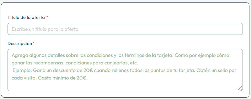 Define los parámetros de tu tarjeta, como el Título de la Oferta y una Descripción de tu programa