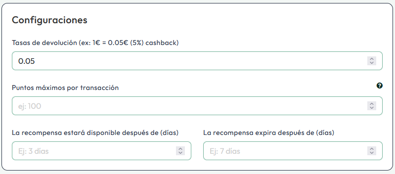 En el menú "Controles", podrás establecer el valor mínimo de compra para la asignación de puntos, puntos máximos por transacción, así como definir cuándo estarán disponibles los puntos para el cliente y una fecha límite para su uso