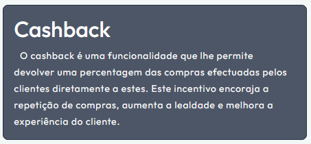 A cada compra, o cliente acumula um valor de cashback (por exemplo, 5% do total pago).