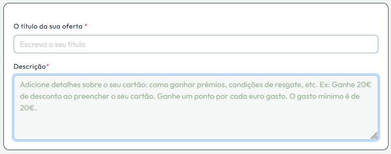 Defina os parâmetros do seu cartão, como o Título da Oferta e uma Descrição do seu programa