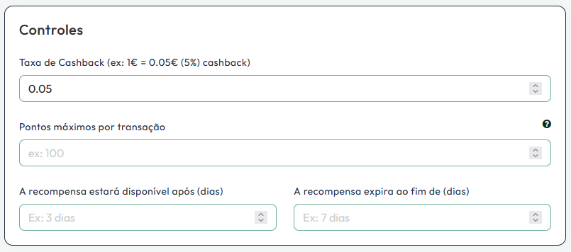 No menu "Controles", poderá definir qual a percentagem do valor de cada compra que ficará para utilização futura, definir a partir de que momento a recompensa estará disponível para o cliente e uma data limite para a utilização da mesma
