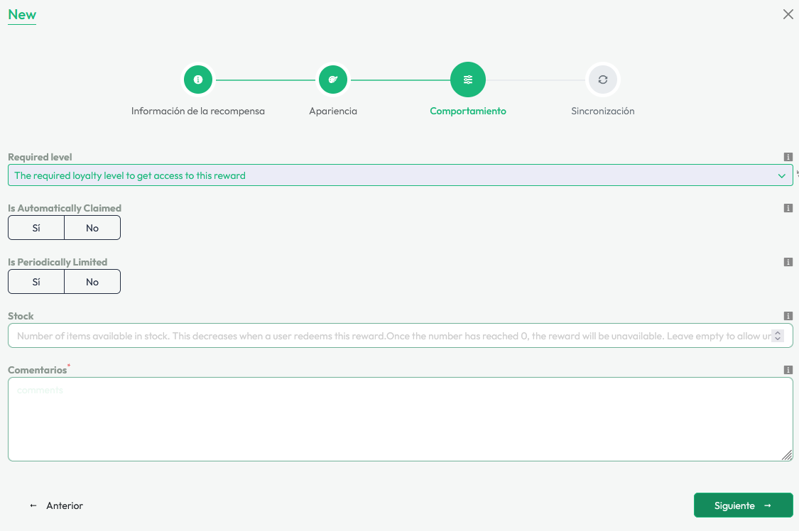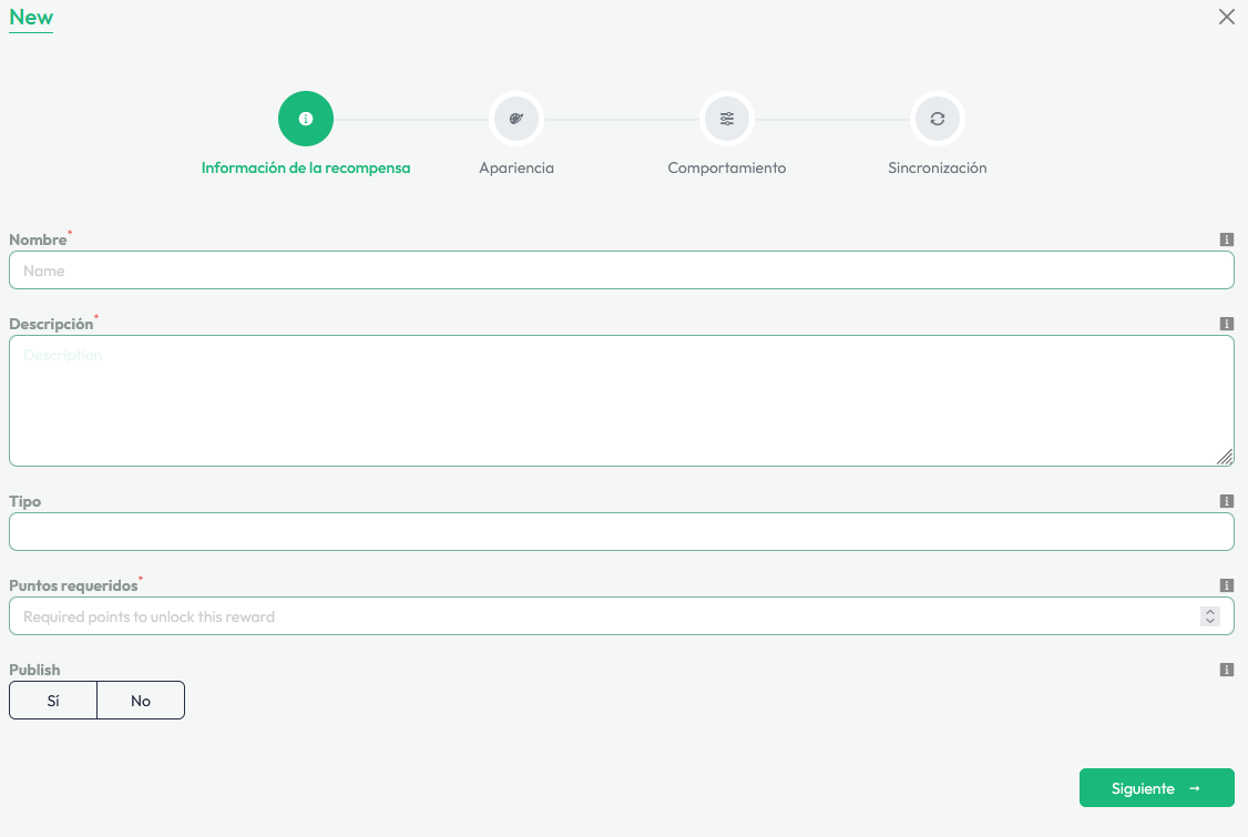 Completa los diferentes campos disponibles para detallar tus recompensas, como por ejemplo un Nombre y una Descripción
