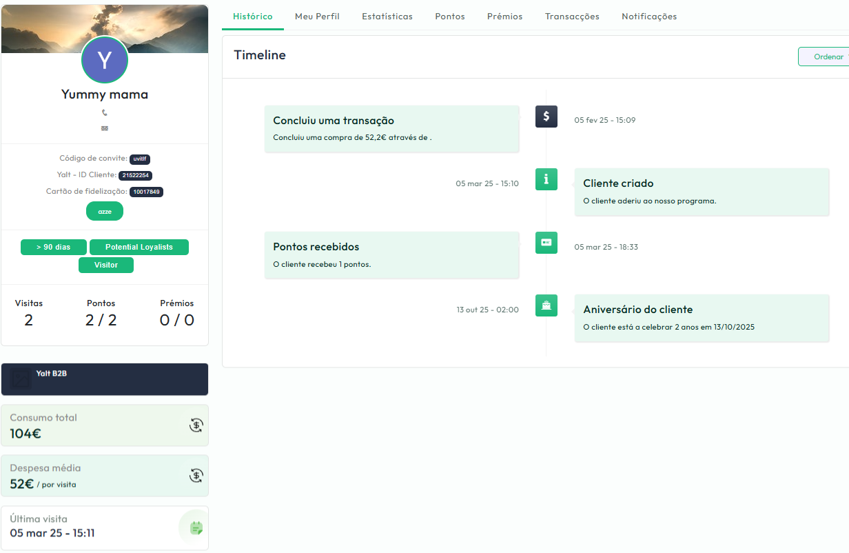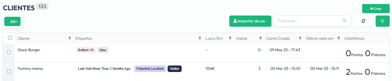 A base de dados é onde estão guardadas todas as informações dos seus clientes — como nome, contacto, número de visitas, histórico de consumo, e mais. Aceder a esses dados é fácil e rápido através do dashboard.