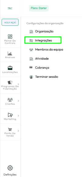Aceda ao menu de "Integrações" através da opção "Definições"