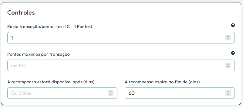 Aqui poderá definir o Rácio/Multiplicador que pretende para o seu programa de fidelização. Poderá escolher uma opção mais convencional, em que cada 1€ corresponde a 1 Ponto, ou usar um multiplicador (Ex: 10), onde por exemplo 7,90€ = 79 Pontos