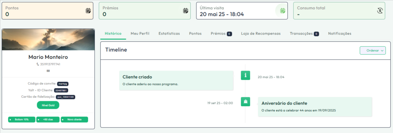 Clique no cliente que pretende para aceder à sua ficha de cliente para informações mais detalhadas, tais como Compras, Pontos, Recompensas ou outras