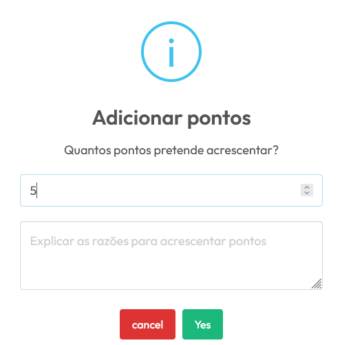 Poderá seguidamente colocar o número de pontos a adicionar à conta do cliente e caso pretenda, indicar uma justificação para esta adição