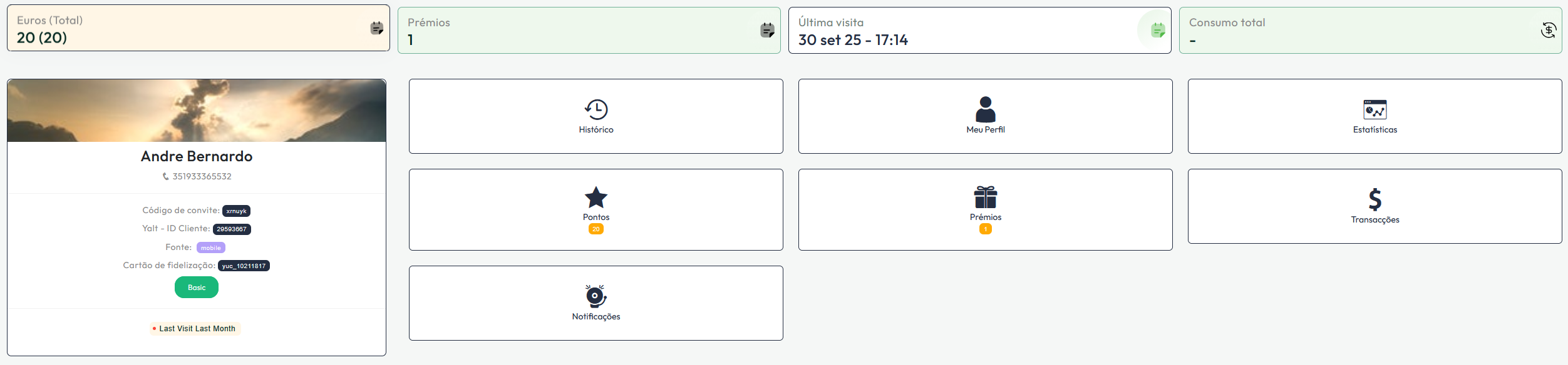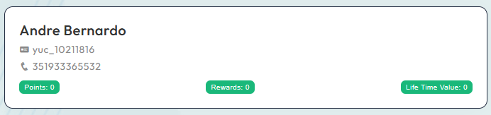 Ao clicar na caixa identificativa do cliente, iremos ter acesso à ficha de cliente e respetivas informações, tais como o histórico, pontos, prémios, recompensas, entre outros