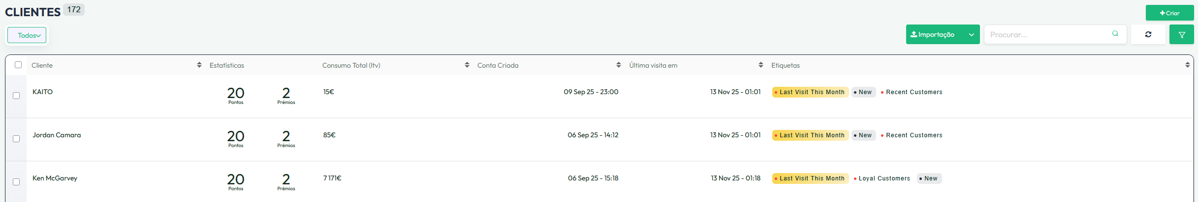 Aqui terá disponibilizada a sua base de clientes e detalhes dos mesmos