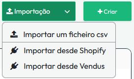 No canto superior direito estão disponíveis duas opções - "Importação" - que permite importar de um ficheiro existente (CSV) ou importar de um plataforma que tenha integrada.